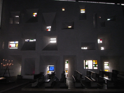 が、内部に入った瞬間、そんな寂しさは吹っ飛びました.暗闇の中に色ガラスの窓から差し込む光があふれ、近づくと強烈になり、遠ざかると点のように消えていく…その美しさというか不思議さに、自分がこの場にたっているという感覚がすらなくなる気がしました.