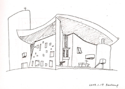 ロンシャンの教会は、よく外観の造形から彫刻的といわれますが、私は外観よりも、内部空間の光の質が素晴らしい『光の彫刻』のような印象をもちました.